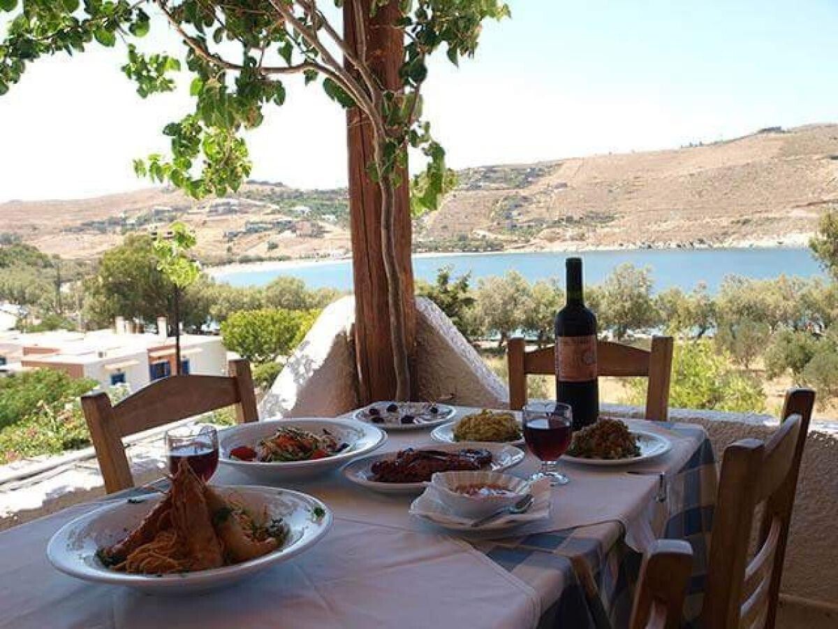 A shaded terrace at the edge of Otzias village with views of the beach. Anna's kitchen serves classic appetisers, delicious homemade pies, a wide variety of home-cooked dishes, and charcoal-grilled fish. The kind of taverna where the food feels truly made from scratch and the atmosphere is unhurried and welcoming.
